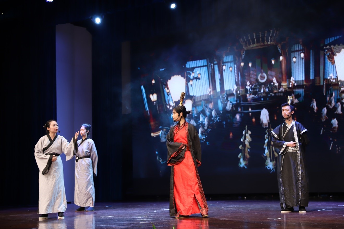 第五个表演的是来自大一财务管理专业的洪兴学社,他们的作品《殉法者》再现了韩非子在秦寻求变法理想,最终以身殉法的悲壮经历,战国形势的波谲云诡、变法志士与保守势力之间的博弈都被他们生动地呈现了出来。评委刘振环教授表示为同学们的表演天分感到惊讶,饰演韩非、姚贾、李斯以及秦王等同学的表演入情、入理、入戏,整个作品矛盾激烈,十分到位,并说“专业、专注是现代社会最重要的两个品质”,同学们今日在舞台上的专注,一定会成就日后在生活工作上的专业。