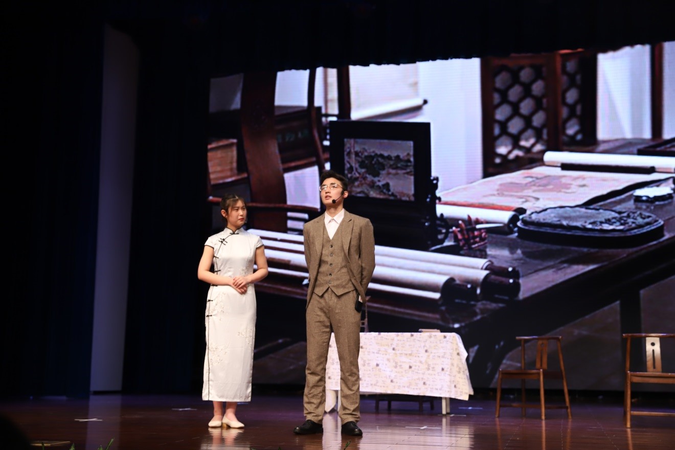 首先为我们带来表演的是大一会计专业的七侠学社,他们的作品《异路同笼鸟》,改编自溥仪的回忆录《我的前半生》,在中年文绣的回忆中将文绣与溥仪离婚的故事娓娓道来。在那个风云变幻的年代里,作为妃子的文绣也在时代风气的影响之下,勇敢地挣脱牢笼,追求自己的幸福。评委汪蓝博士高度赞扬了同学们的表演,尤其是三位主角中年文绣、青年文绣以及溥仪,并且十分欣赏他们在结尾采取中年文绣与青年文绣对话的形式,在时空交错中升华了作品的主题,是一次相当成功的表演与改编。