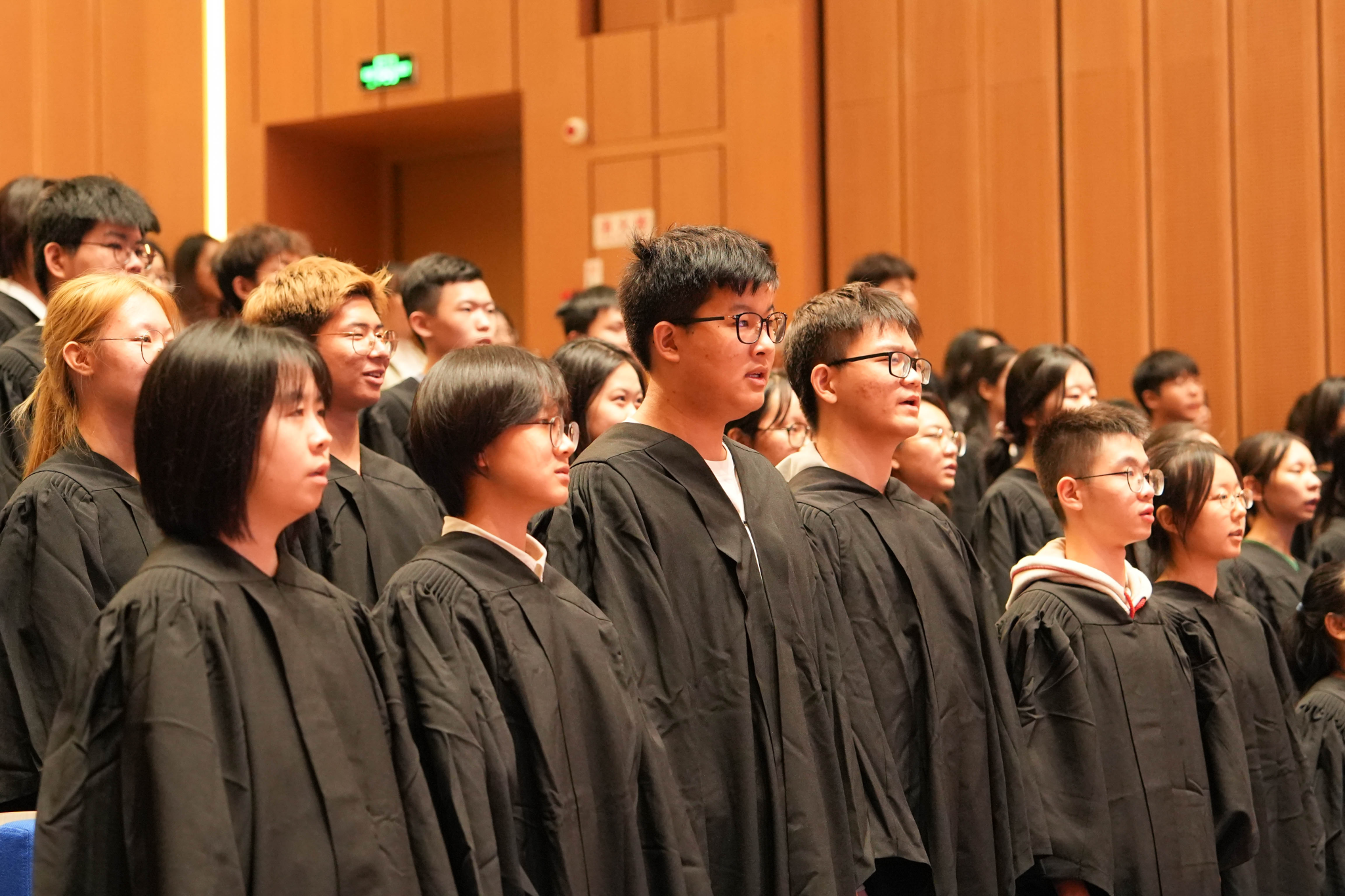 随后,由台上行礼学生带领全体学子齐声朗读《大学》选段,时刻铭记“正心,诚意,格物,致知”的大学之道。整个仪式充满了庄重且富有仪式感的氛围。