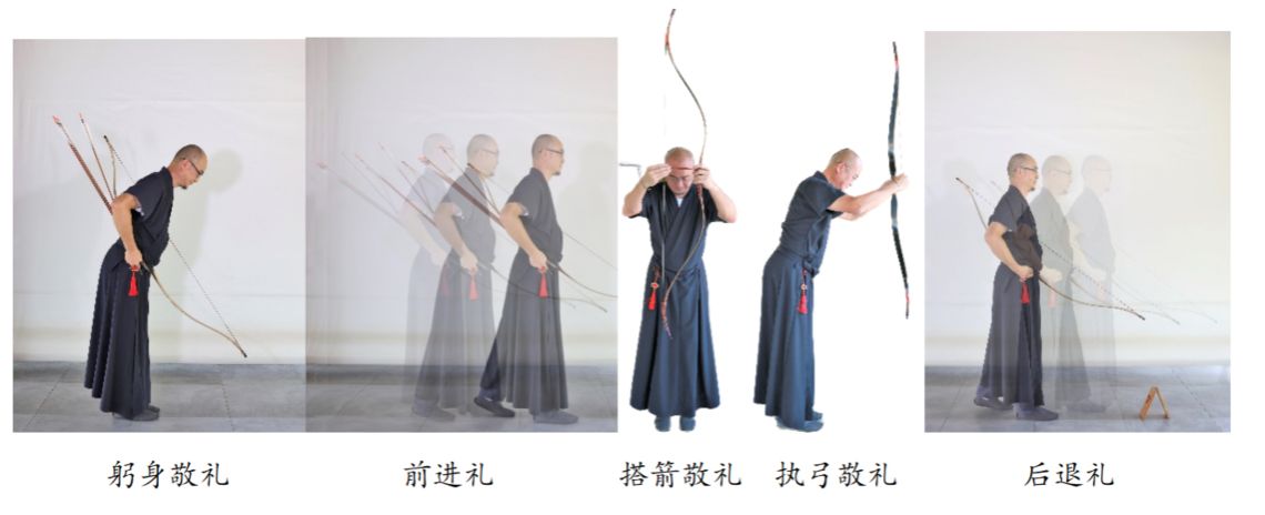 技术习得之外,导入“躬身敬礼、前进礼、搭箭敬礼、执弓敬礼、后退礼”等5项基础礼仪(见图5),使古代“君子之争”的理念具象化为现代团队合作训练模块,最后落实在“同修射礼”上(见图6),即在两人共同进退和依次射箭的过程中去体认团队合作的核心精神——与另一自立自强的个体合作。