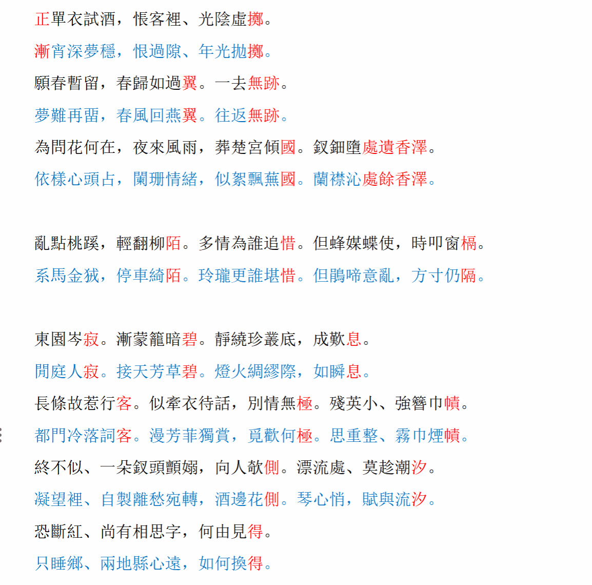 節錄對照,周邦彥《六醜·薔薇謝後作》(黑色字行)和饒宗頤《六醜·睡》(藍色字行):