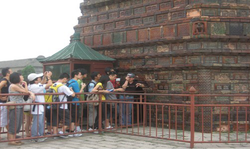 次日上午,海峡两岸第四届国学营“中原文化之旅”学术研讨会在河南大学文学院举行。参加研讨会的专家学者一一阐述自我研究所得,领域实广,观点新奇,国学营师生颇感获益良多。下午,游览的是历经风霜仍屹立不倒的铁塔、繁塔,以及禹王台、圣心主教堂、文庙等景点。当晚,大家在热闹的夜市品味了多样的小吃,又在戏楼听了独具风味的豫剧,一日之劳累一扫而光。13日清晨,国学营早早便前往香火鼎盛的大相国寺,一路走过熙熙攘攘的人群一路聆听龚老师对于禅宗文化的讲解。龚老师谈到,大相国寺自宋代起便是盛名远著的佛门宝刹,律宗与禅宗的法统在这里都能找到源流。相国寺的高僧自古就有学问深厚的传统,日本的空海法师也曾来此求学。寺内尚有几间殿为清代遗留,法度俨然。后殿所供奉之千手千眼观音,系密宗影响,雕刻亦颇精致。整间寺庙香火鼎盛,一片烟雾缭绕,透过这帘幕般的烟气与香味,但见一派繁华与喧嚣的“人间佛教”景象。