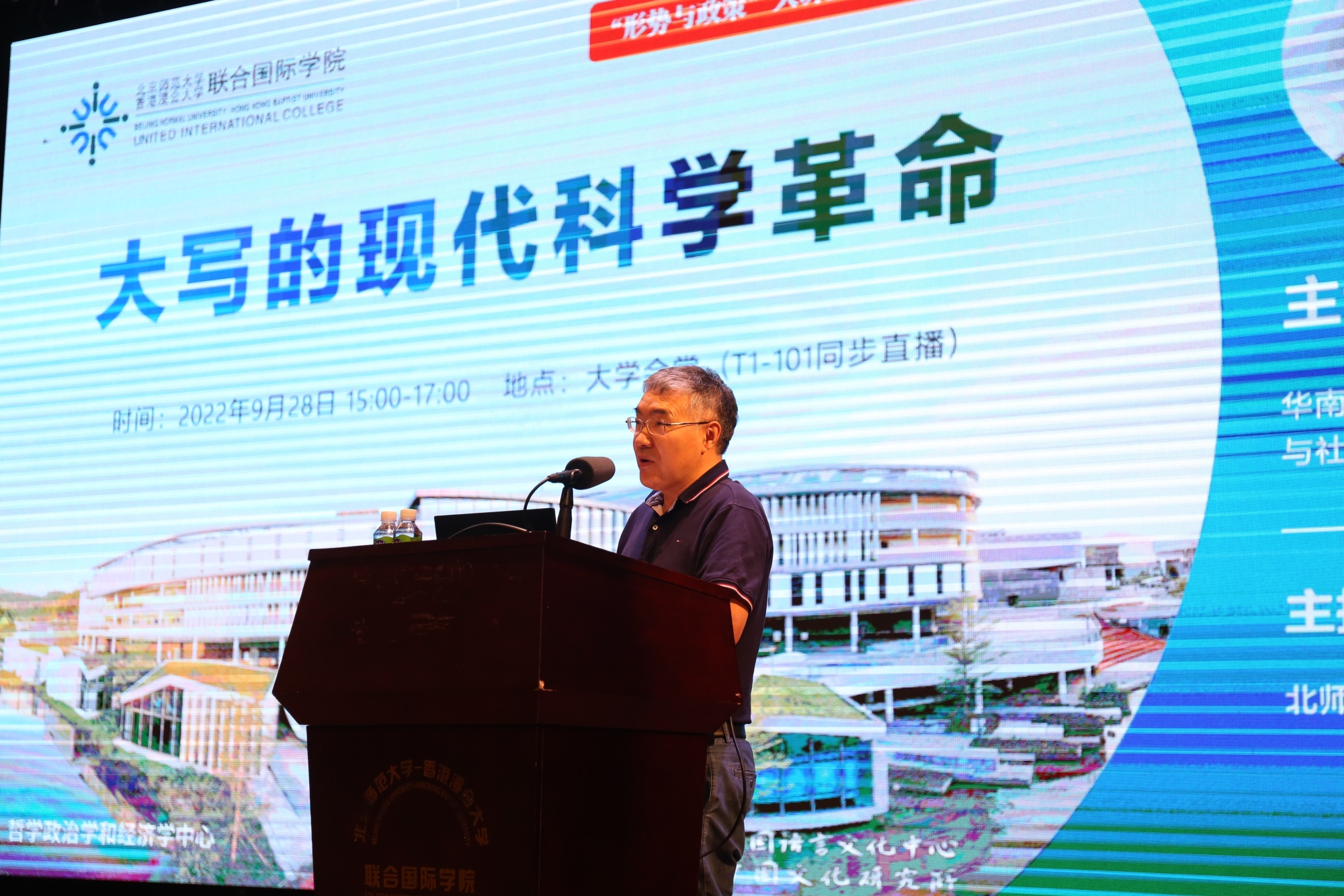 2022年9月28日,由华南师范大学特聘教授、博士生导师肖显静教授主讲、北师港浸大教务长李建会教授主持的“形势与政策系列讲座”第三讲“大写的现代科学革命”在UIC大学会堂成功举行。
