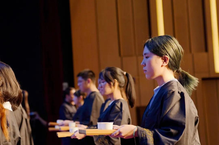 雅乐声起,一曲《木瓜》正式拉开了大学敬师礼的序幕。敬茶前,师长为学子整理衣冠。古代拜师礼要求学生备束修六礼敬师,今日学子们以茶代礼,表达敬意。三敬三饮,一品茶香甘味,象征学海苦中求乐;二品学子敬意,愿志修身治国平天下;三品师道尊严,以身垂范,传道授业。随后,由高年级学子带领全体学子齐声朗读《大学》选段,时刻铭记“正心,诚意,格物,致知”。