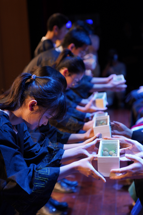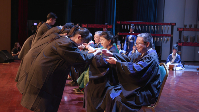作为一所结合国际化与本土化的博雅大学,北师港浸大(UIC)通过15年的实践,已形成了融汇中西文化的独特传统。在各色富有仪式感的活动当中,高桌晚宴、大学敬师礼、成年礼等沿袭了中西方传统文化的活动交相辉映,为校园文化增添许多色彩,也成为UIC师生关系的美好见证。10月22日晚,由全人教育办公室、玉振金声雅乐团主办的庚子年北师港浸大第七届大学敬师礼于演艺厅举行。一杯清茶,一声鼓响,“明理崇德,尊师尚学”的精神在此间传承。
